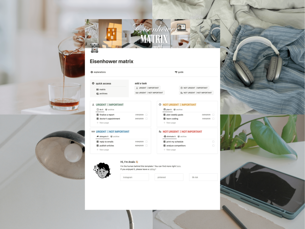 Take control of your time and priorities with this Eisenhower Matrix in Notion. A simple, effective, and adaptable tool to help you stay focused and organized.