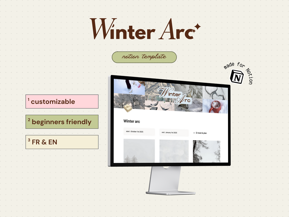 A gentle and balanced Winter Arc Notion template to turn your winter into a season of well-being, organization, and personal growth.
